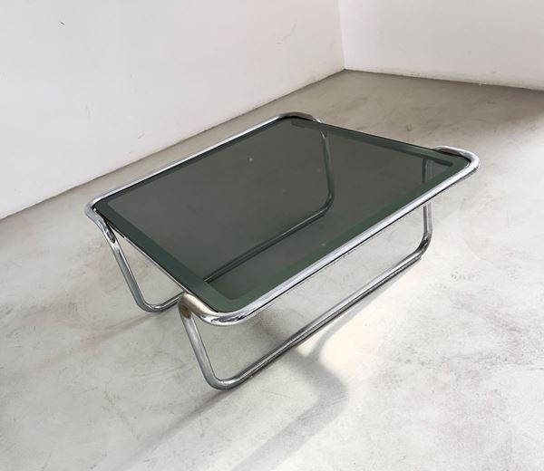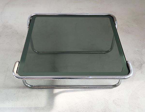 Tavolino quadrato con base in metallo cromato e piano in cristallo fumè