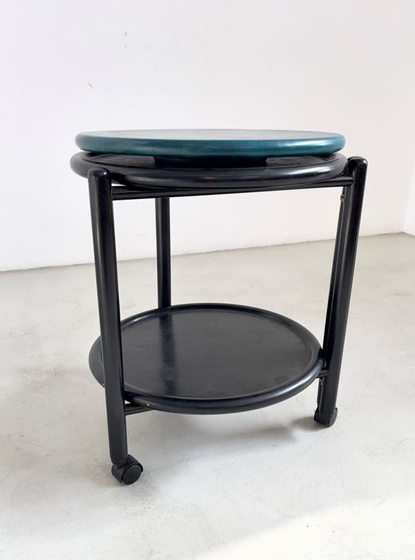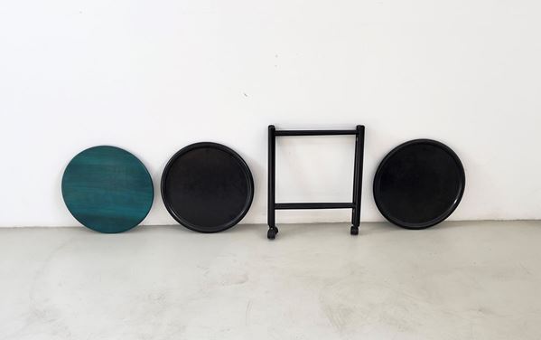 Tavolino smontabile in legno laccato con rotelle e tre ripiani. Manifattura italiana. Anni '70.