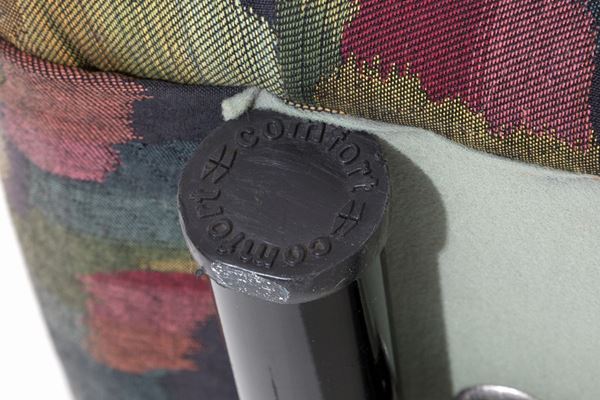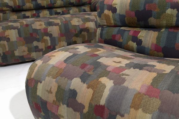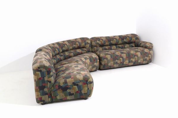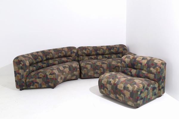 Divano Stringa componibile a tre elementi in legno, cotone e piedini in metallo nero verniciato. Con marchio del produttore. Produzione COMFORT MEDA. Anni '70.