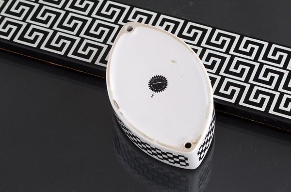 Una scatola portasigarette in metallo (Alt. cm. 9 Lung. cm. 40 ca.) e un posacenere ovale in ceramica (Alt. cm. 9 Lung. cm. 15 Prof. cm. 3,5 ca.). Produzione FORNASETTI, MILANO.