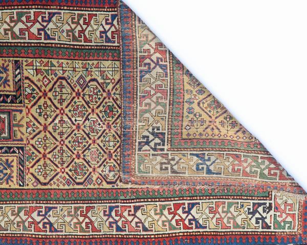 Tappeto Daghestan Preghiera in lana. Caucaso. Fine XIX secolo. Tappeto in vello, mancano nei quattro lati l'ultima cornice, vari restauri e punti deboli sul campo.