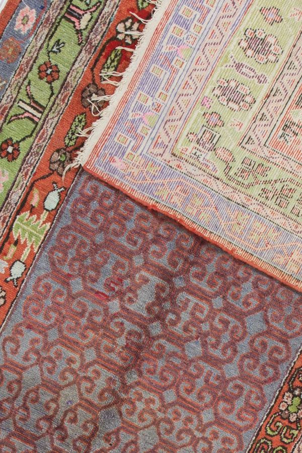 Tappeto Khotan in lana. Turkestan Orientale. Metà XX secolo. Ottimo stato di conservazione, campo in vello con piccolissimi punti rimpelati.