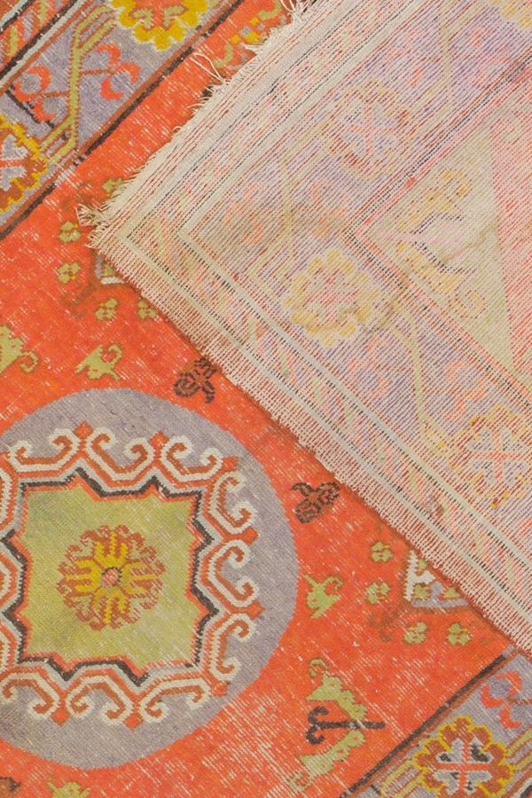 Tappeto Khotan in lana. Turkestan Orientale. Inizi XX secolo. Buono stato di conservazione con aree consumate.