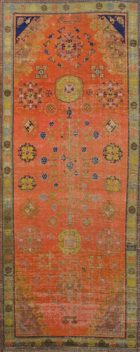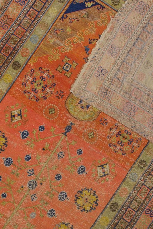 Tappeto Khotan in lana. Turkestan Occidentale. Inizi XX secolo. Buono stato di conservazione, zone consumate.