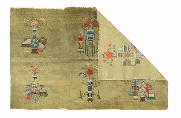 Tappeto Pekino in lana. Cina. Metà XX secolo. In vello, macchie e sbavature di rosso e i lati sono da sistemare.