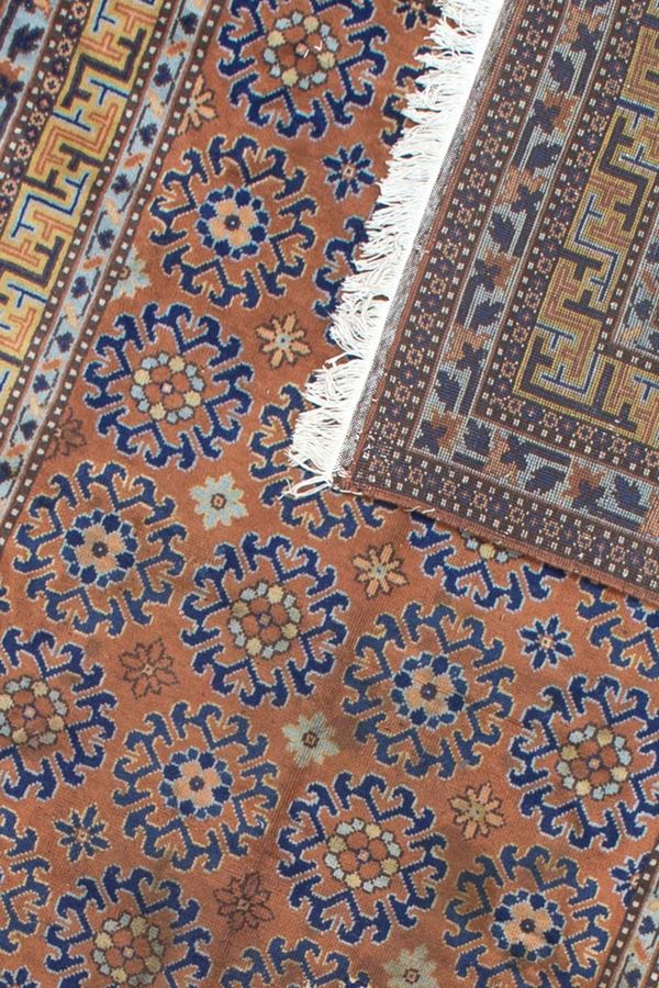 Tappeto Yarkanda in lana. Turkestan Orientale. Metà XX secolo. Ottimo stato di conservazione, campo in vello, piccolissimi punti di rimpelature.