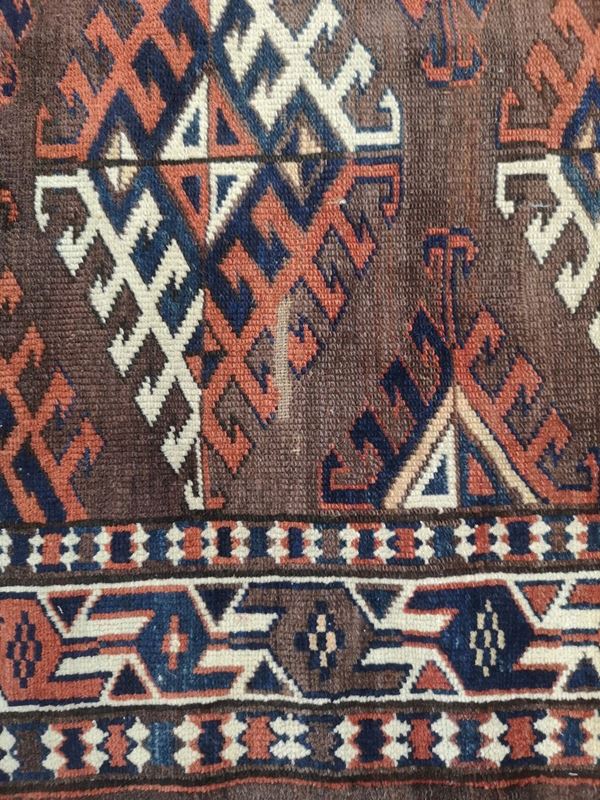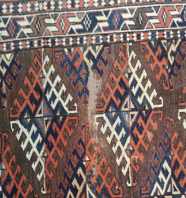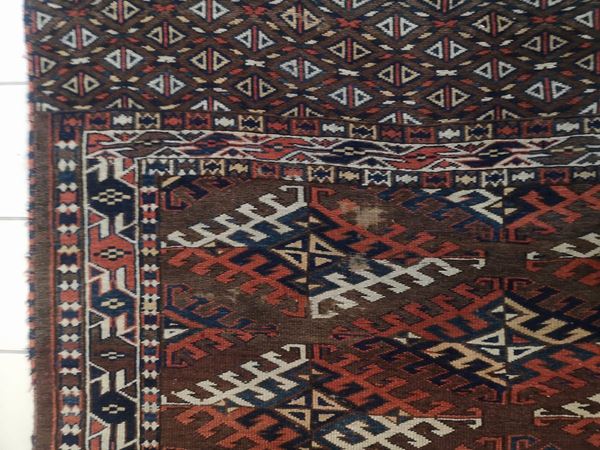 Tappeto Yomut in lana. Turkestan Occidentale. Seconda metà del XIX secolo. Buono stato di conservazione, quattro lati originali, piccole zone consumate.
