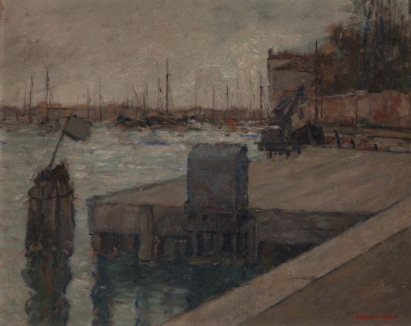 Dipinto olio su compensato raff. "VEDUTA DI PORTO". Firmato in basso a destra. In cornice.