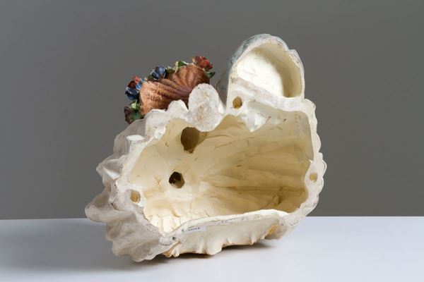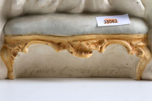 Scultura in ceramica raff. ''DAMIGELLA CON BIMBO E MAZZO DI FIORI''. Firmata sul retro. Lievi difetti.