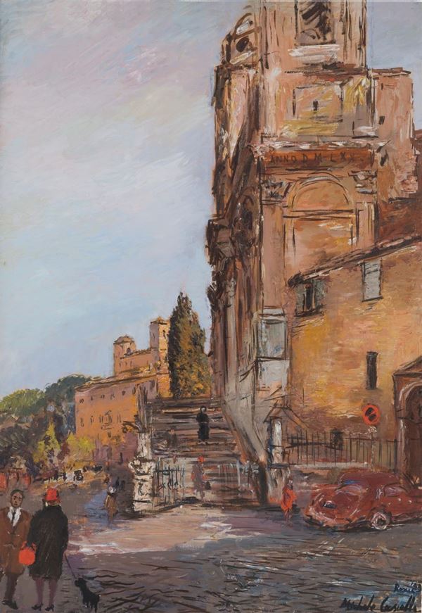 Dipinto olio su tela raff. ''TRINITA' DEI MONTI''. Firmato e datato Roma 49 in basso a destra. In cornice.