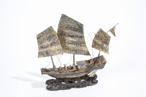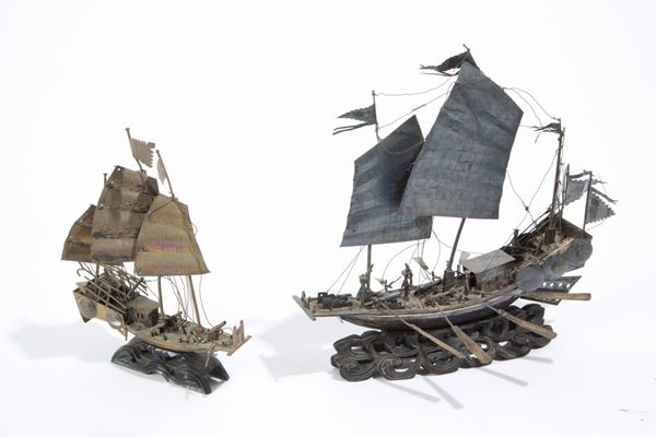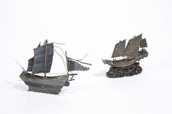 Cinque navi in argento, gr. 850 ca. complessivi. Cina. Periodo repubblica (1912-1949). Misure varie.