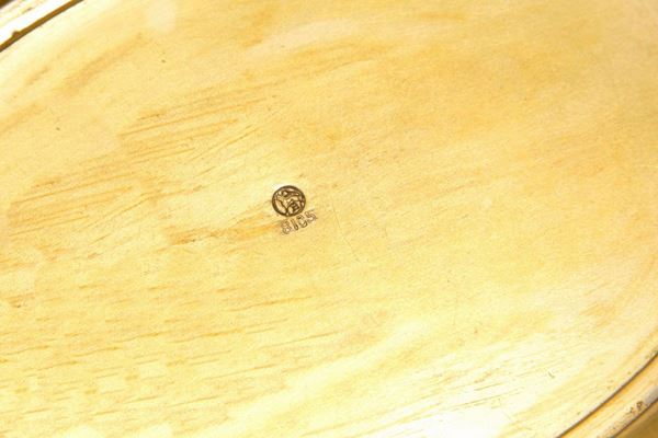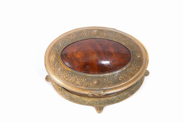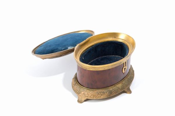 Cofanetto ovale in bronzo finemente cesellato e radica di betulla. Fine XIX secolo.
