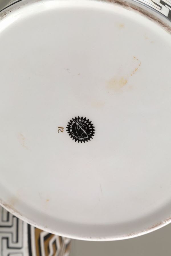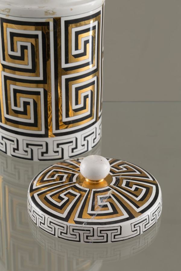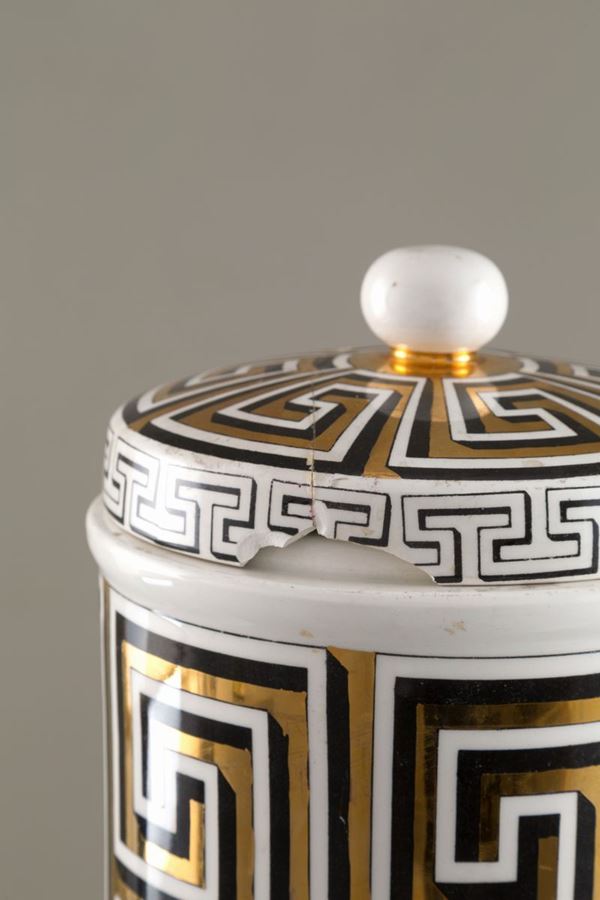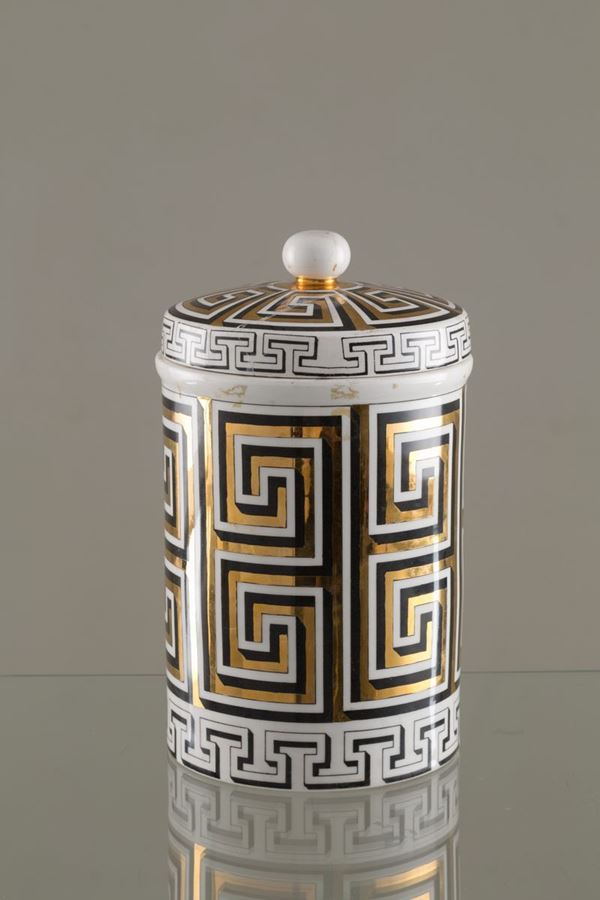 Contenitore a cilindro con coperchio in ceramica. Produzione FORNASETTI. Con marchio del produttore sul fondo. XX secolo. Rotture al coperchio.