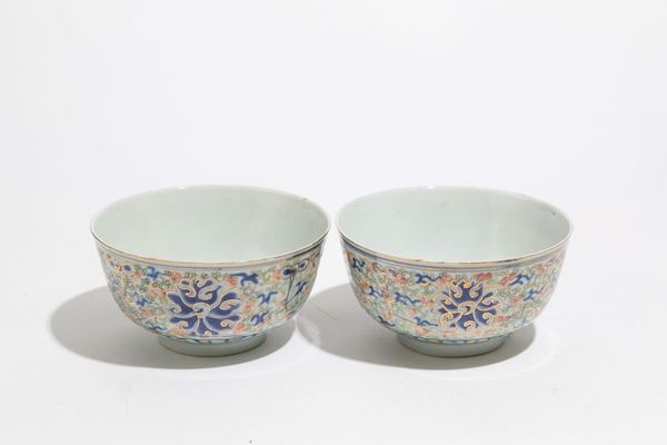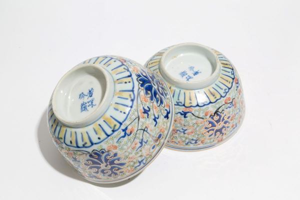 Coppia di ciotole in porcellana dipinta a motivi floreali. Marcate sul fondo. Cina. Lievi difetti.