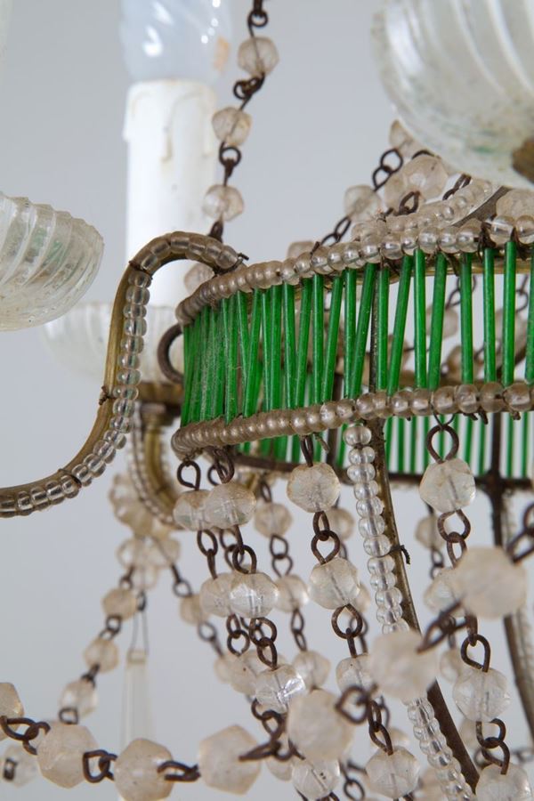 Coppia di lampadari a mongolfiera sei luci in ferro con pendenti e perline di vetro. XX secolo.
