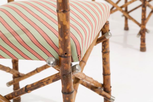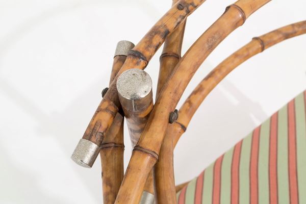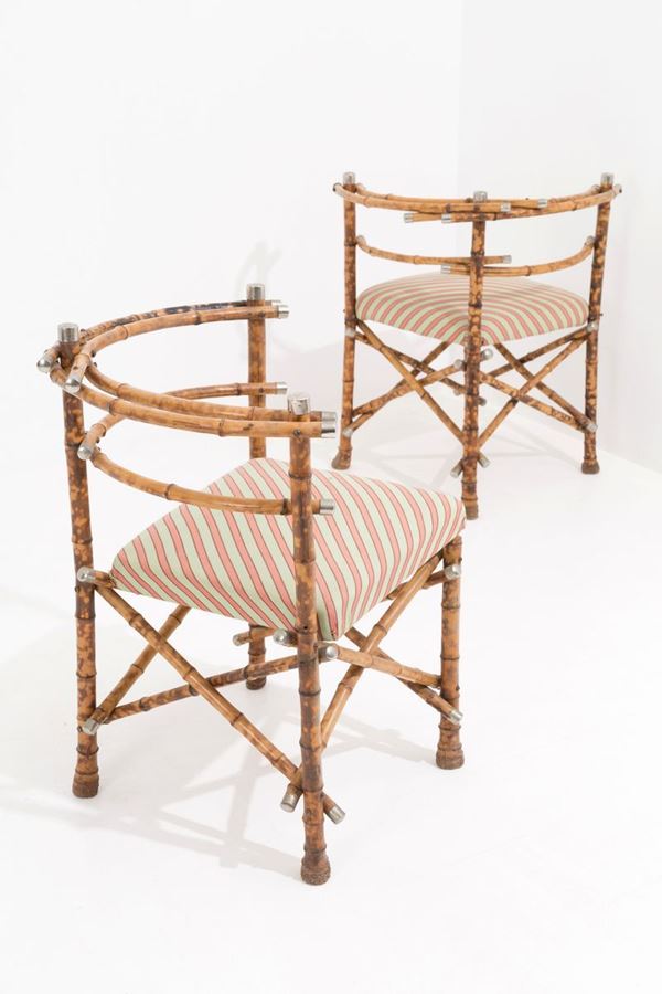 Coppia di poltrone a pozzetto in bambù curvato con puntali in lamiera. Inizi XX secolo.
