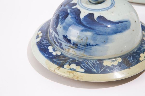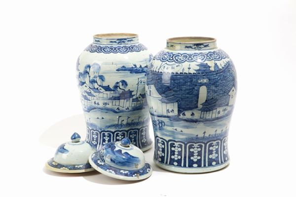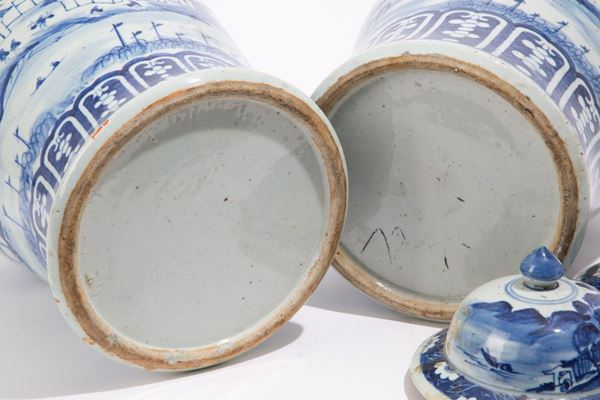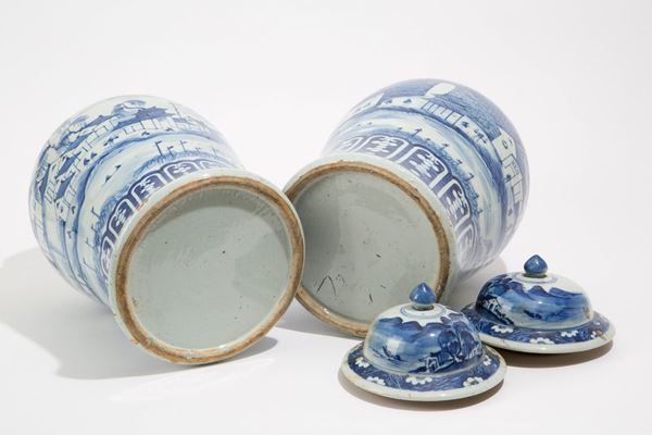 Coppia di potiches in porcellana bianca e blu raff. "PALAZZO IMPERIALE CON FIGURE". Cina. Restauri.