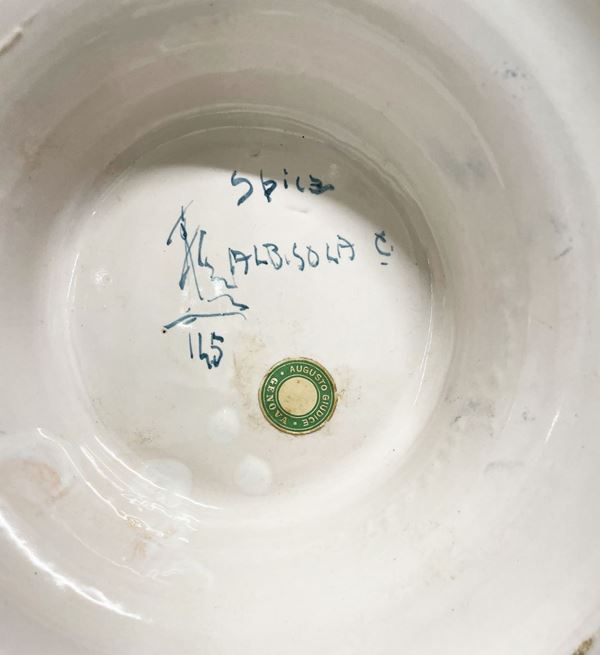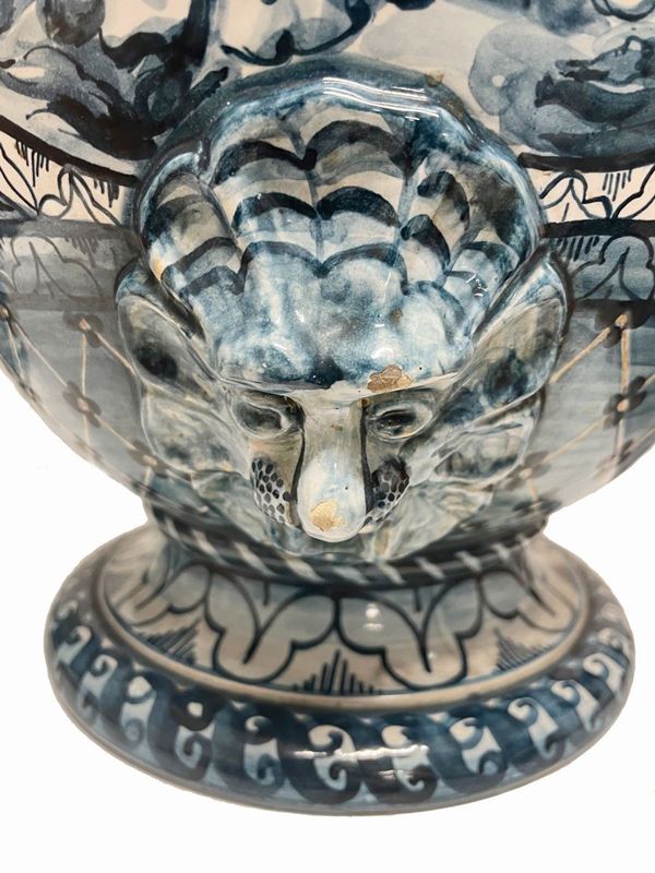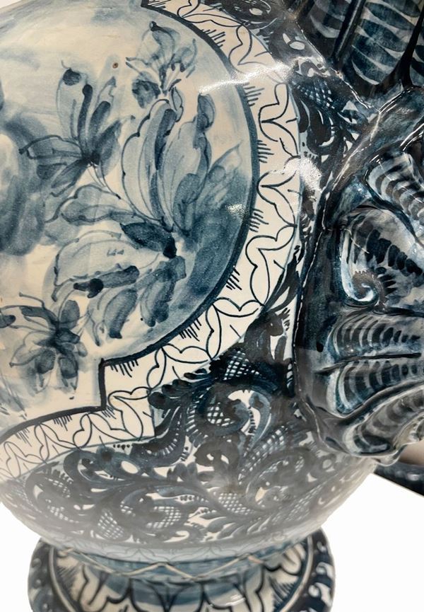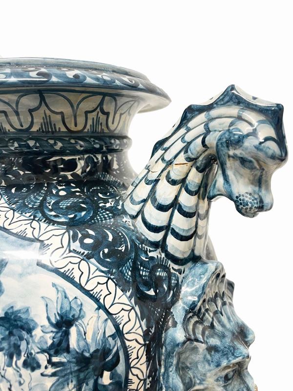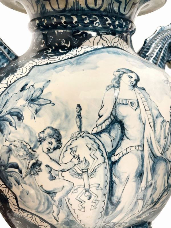 Coppia di vasi in porcellana dipinta con anse a guisa di cavallo marino. Manifattura CAPODIMONTE. Fine XIX secolo.