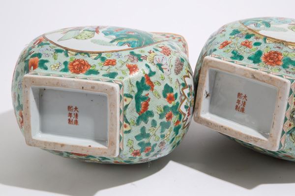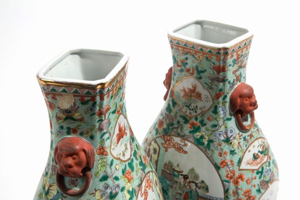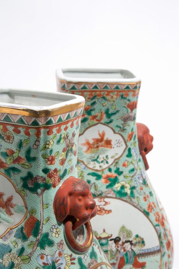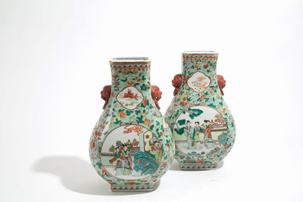Coppia di vasi in porcellana dipinta famiglia verde raff. "SCENE DI VITA" entro riserve. Marcati sul fondo. Cina.