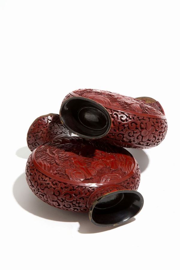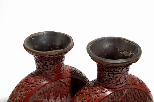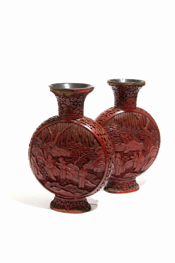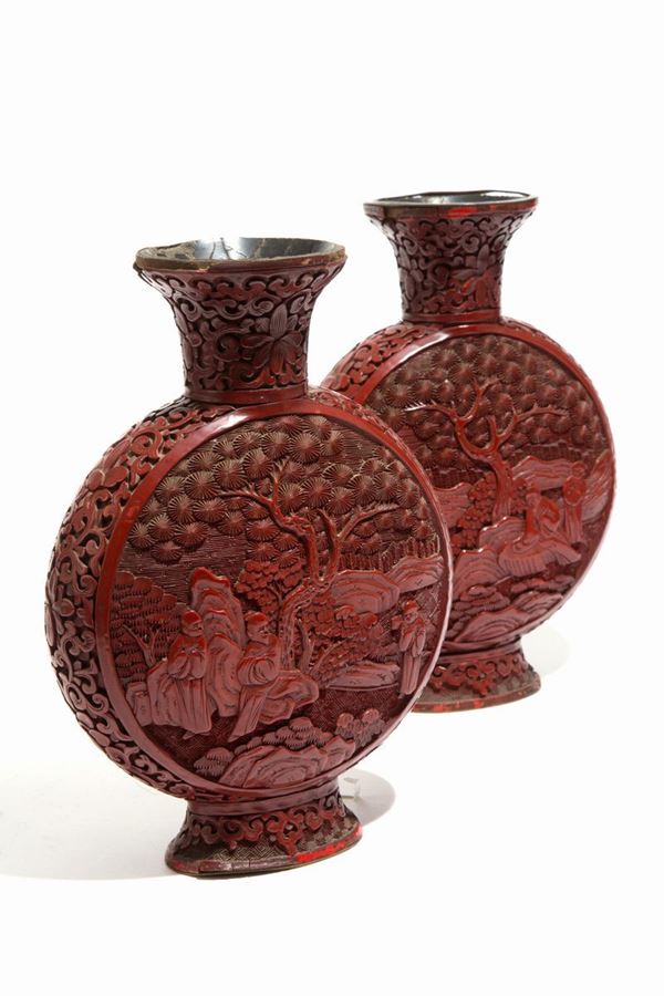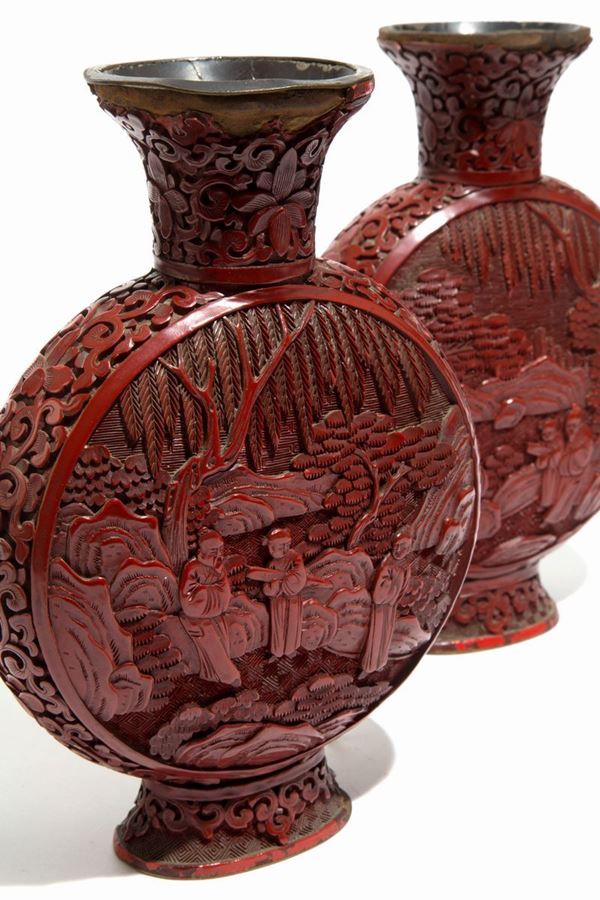 Coppia di vasi in lacca raff. "SCENE DI VITA". Cina. Difetti.