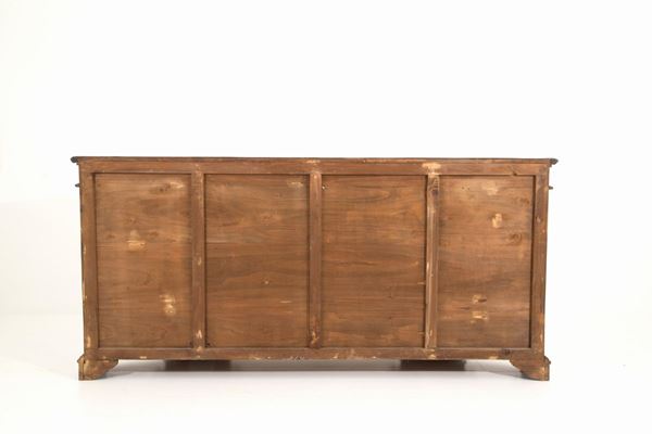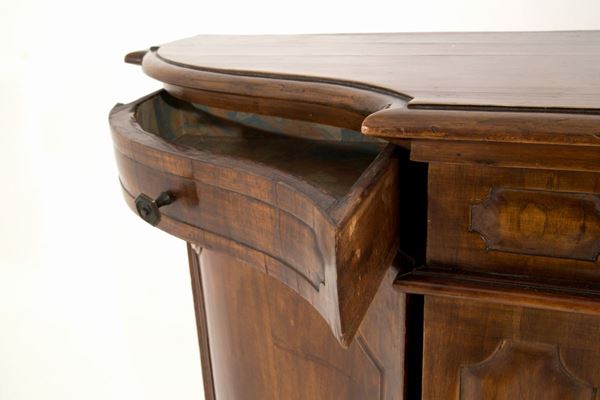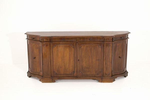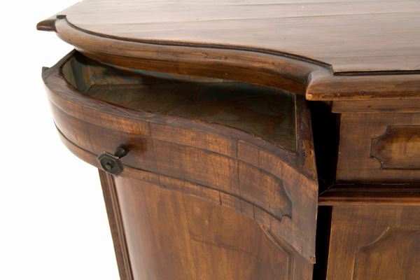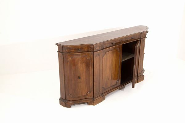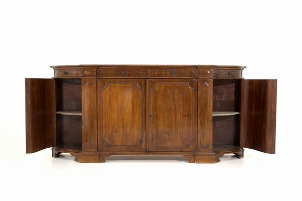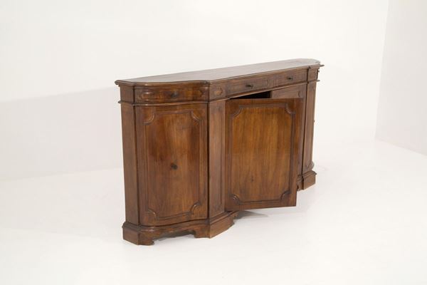 Credenza in legno di noce mossa sui fianchi. Veneto. Inizi XX secolo.