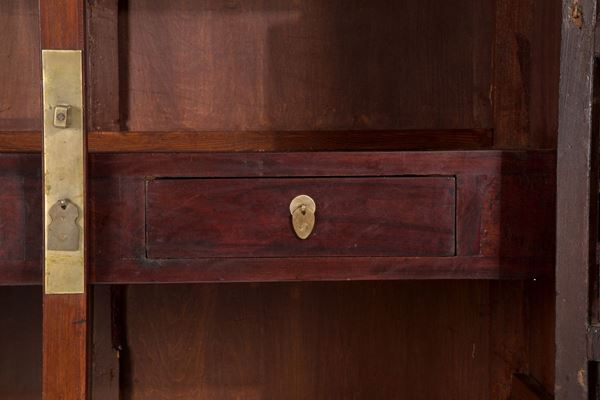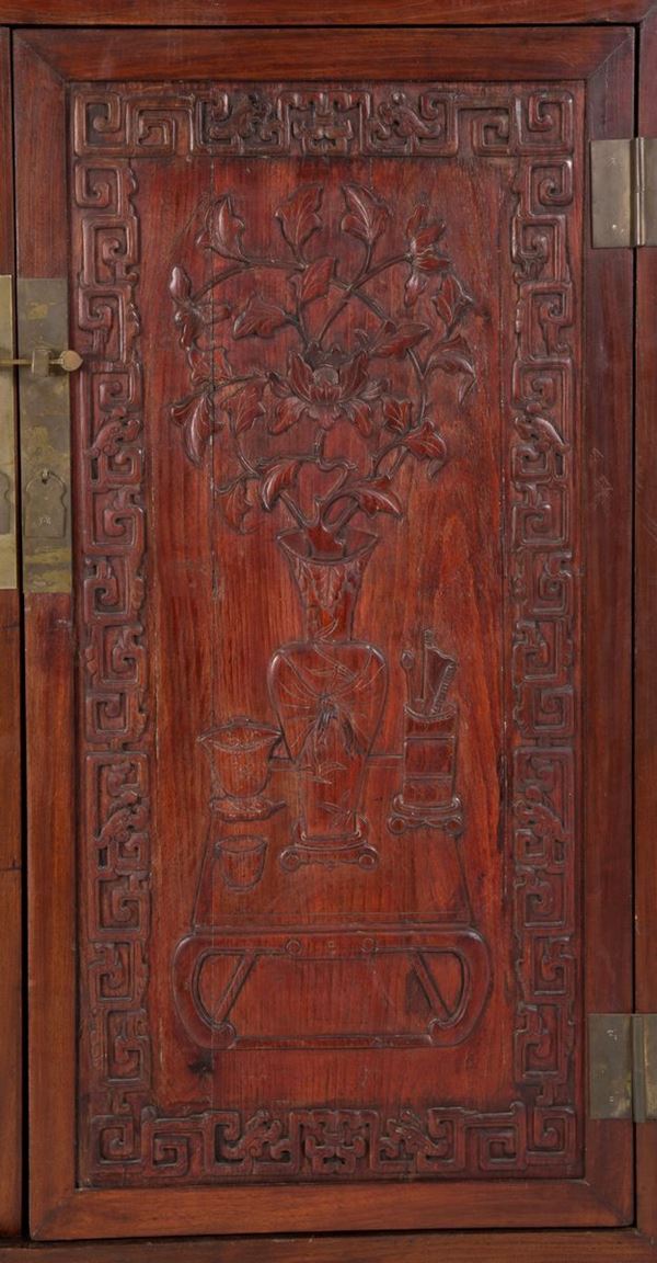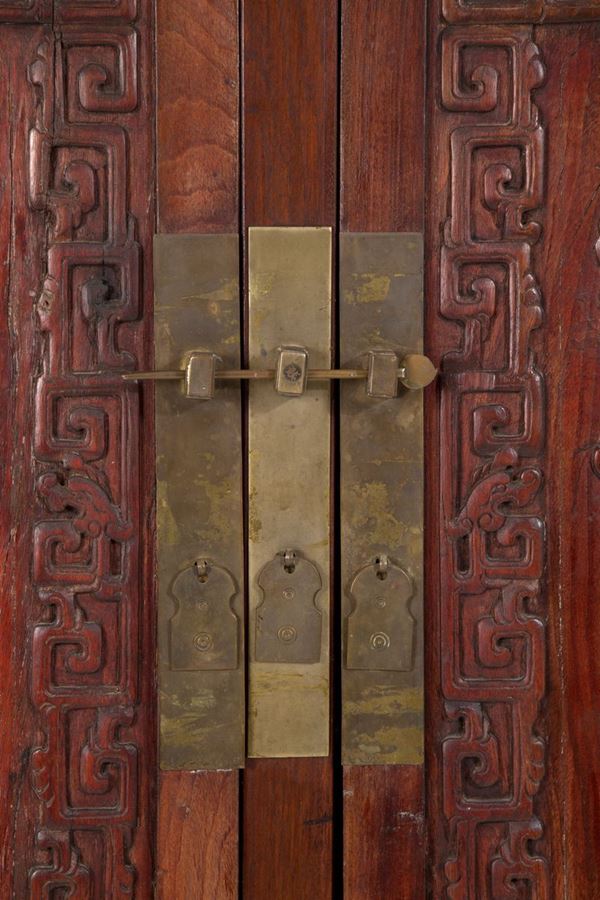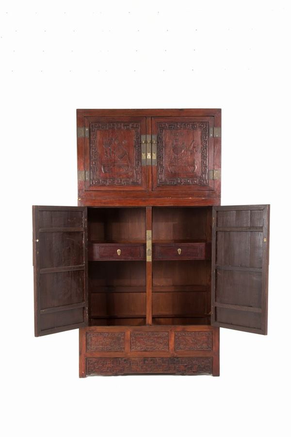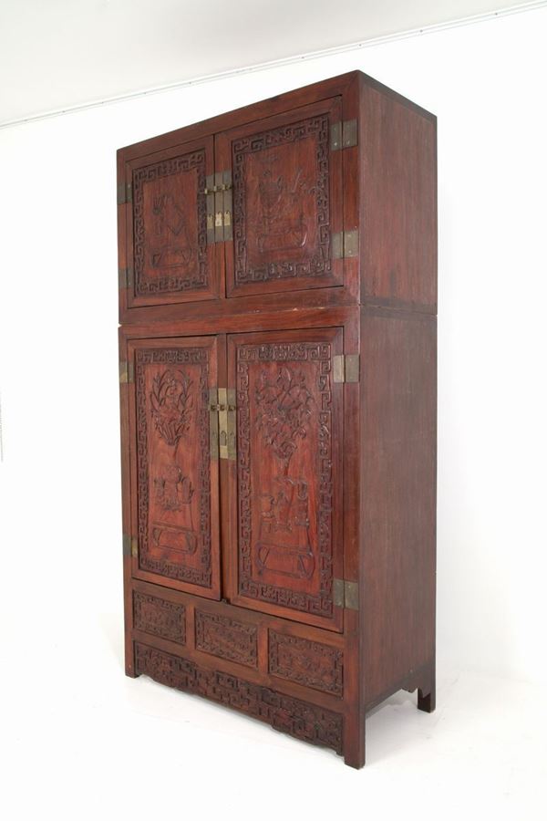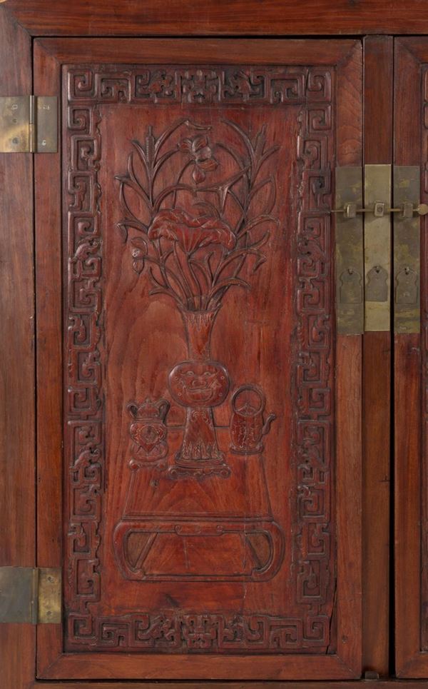 Credenza a due elementi in legno di frutto con ante intagliate a motivi floreali e guarnizioni in bronzo. Cina.