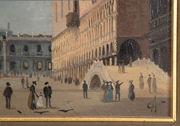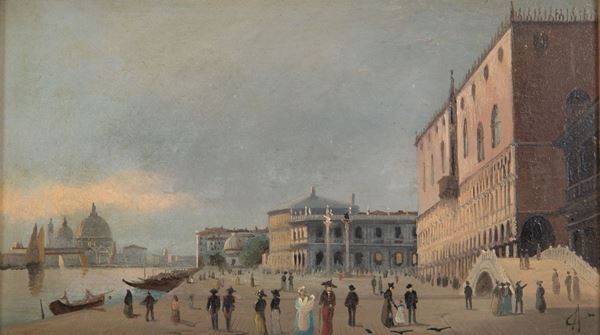 Dipinto olio su tavola raff. ''BACINO DI SAN MARCO A VENEZIA''. Siglato C.A. in basso a destra. Fine XIX secolo. In cornice intagliata e dorata.