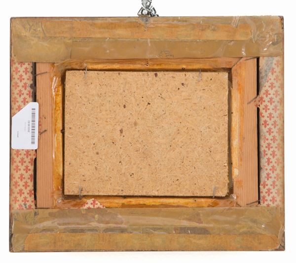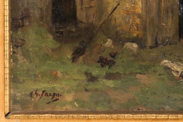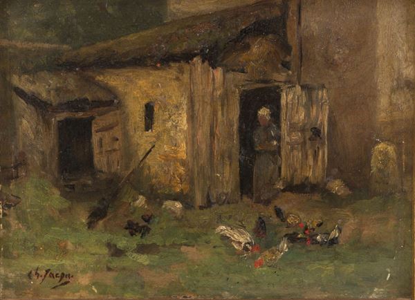 Dipinto olio su tavoletta applicata su truciolato raff. "CONTADINA NEL POLLAIO". Firma non identificata in basso a sinistra. XIX secolo. In cornice.
