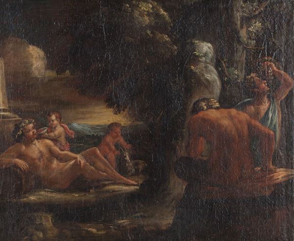 Dipinto olio su tela raff. ''BACCANALE''. Fine XVII secolo. In cornice dorata.