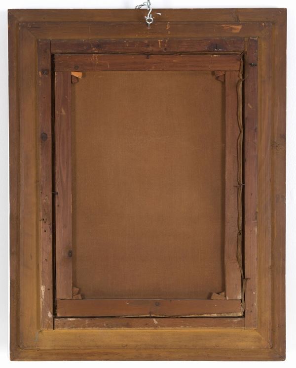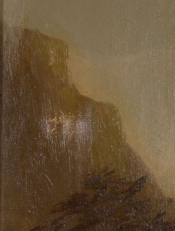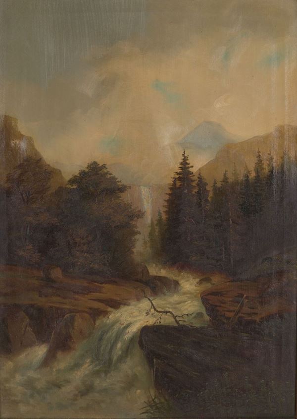 SCUOLA OLANDESE DEL XIX SECOLO. Dipinto olio su tela raff. ''BOSCO CON CASCATA''. Firma non identificata. In cornice dorata.