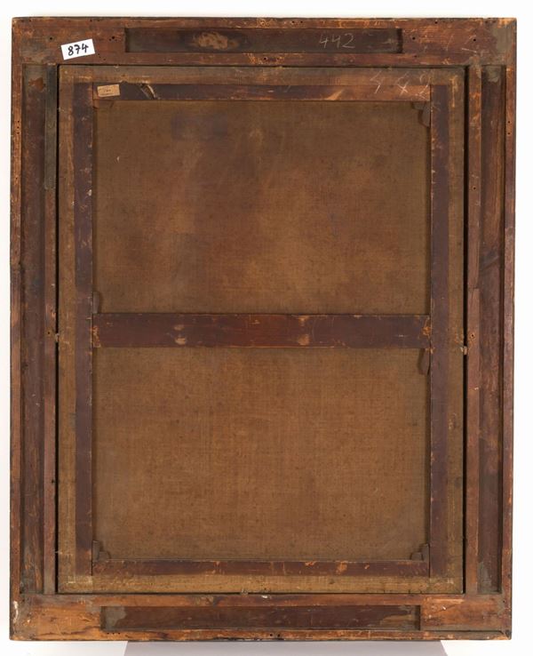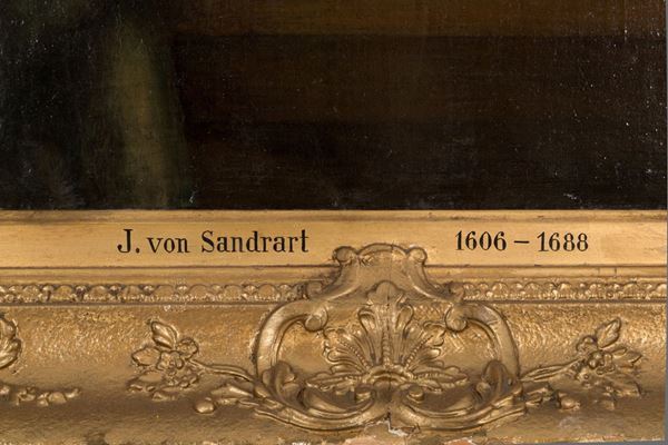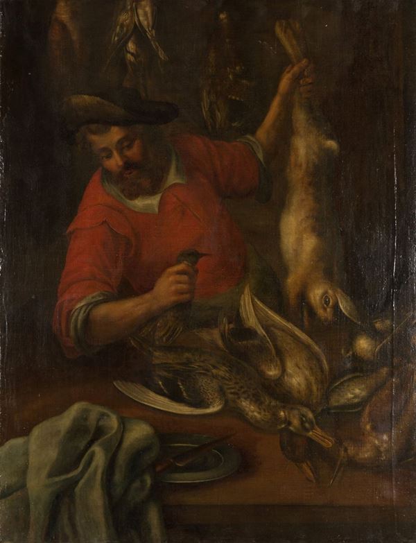 SCUOLA FIAMMINGA DEL XVIII SECOLO. Dipinto olio su tela raff. ''PERSONAGGIO IN CUCINA CON CACCIAGIONE''. In cornice dorata.