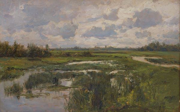 Dipinto olio su tavoletta raff. ''LAGUNA''. Firmato in basso a destra. XIX secolo. In cornice.
