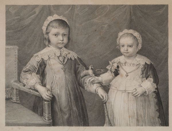 Incisione su carta raff. "I FIGLI DI TOMMASO DI SAVOIA". Da dipinto di di Van Dyck. Inizi XVIII secolo. In cornice.