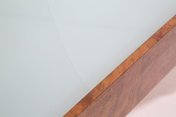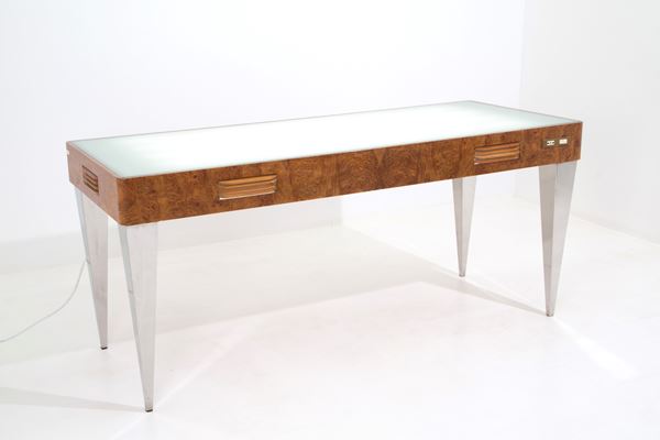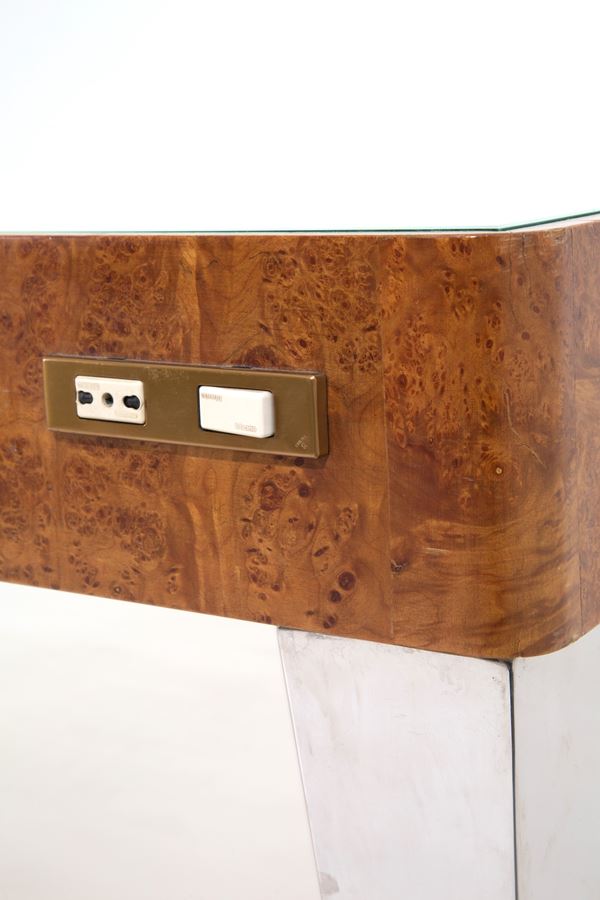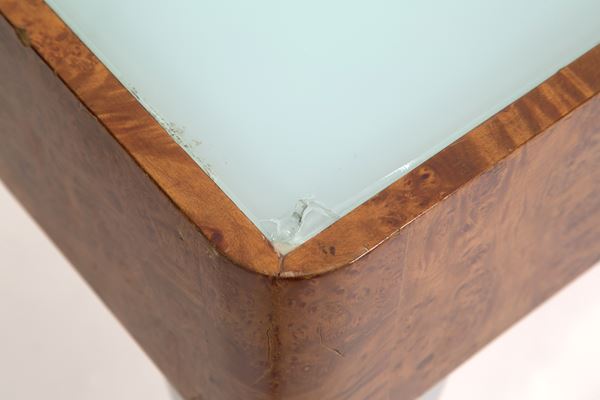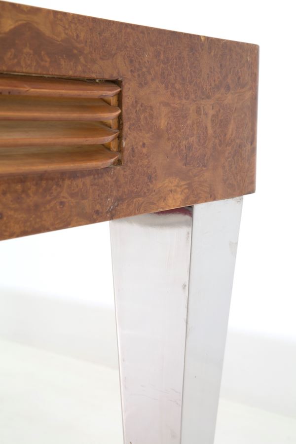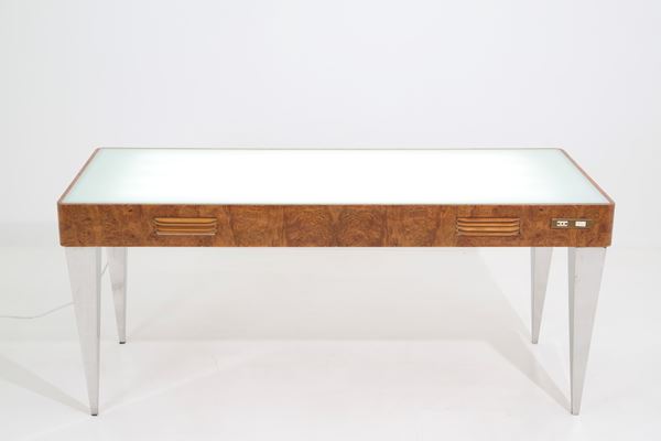 Tavolo “Luci nella notte” per lettura immagini e diapositive in legno e radica con sfoghi a persiana laterali per il raffreddamento e lampade a luce fredda all'interno. Montato su piedi in acciaio fatti a mano con piano di appoggio in plexiglass bianco e vetro sabbiato. 1981. Esemplare unico.