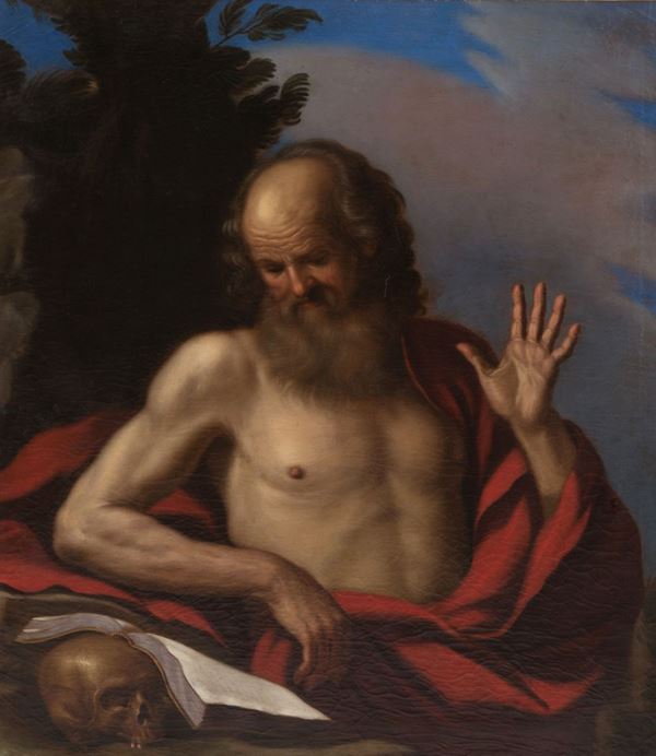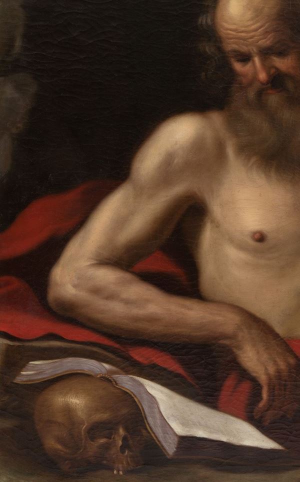 Dipinto olio su tela raff. ''SAN GIROLAMO''. In cornice dorata. Lievi difetti.