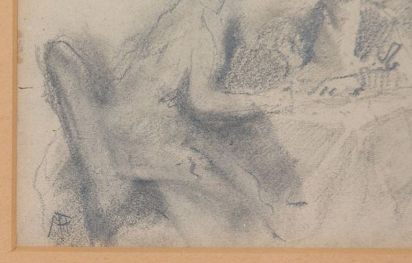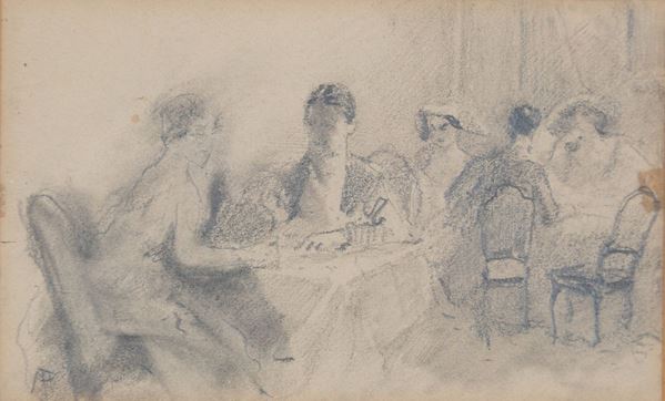 Disegno a matita su carta raff. ''PERSONAGGI AL RISTORANTE''. Siglato in basso a sinistra. In cornice.
