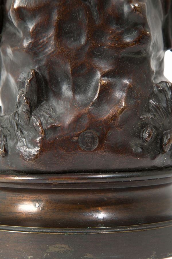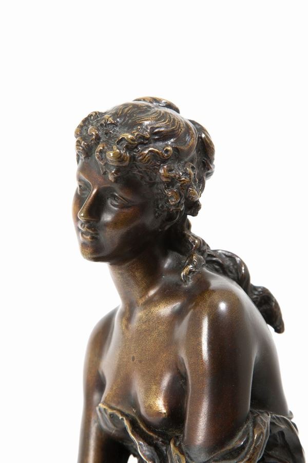 Scultura in bronzo patinato raff. "DONNA SUCCINTA". Firmata alla base. Datata 28 aprile 1908 sul supporto. Marcata SOCIETE DES BRONZES DE PARIS sul retro.