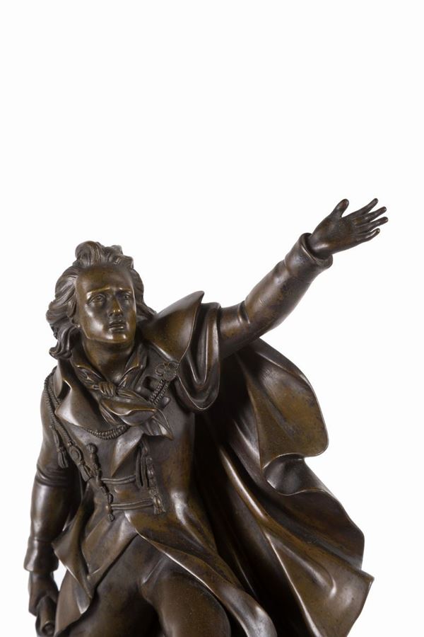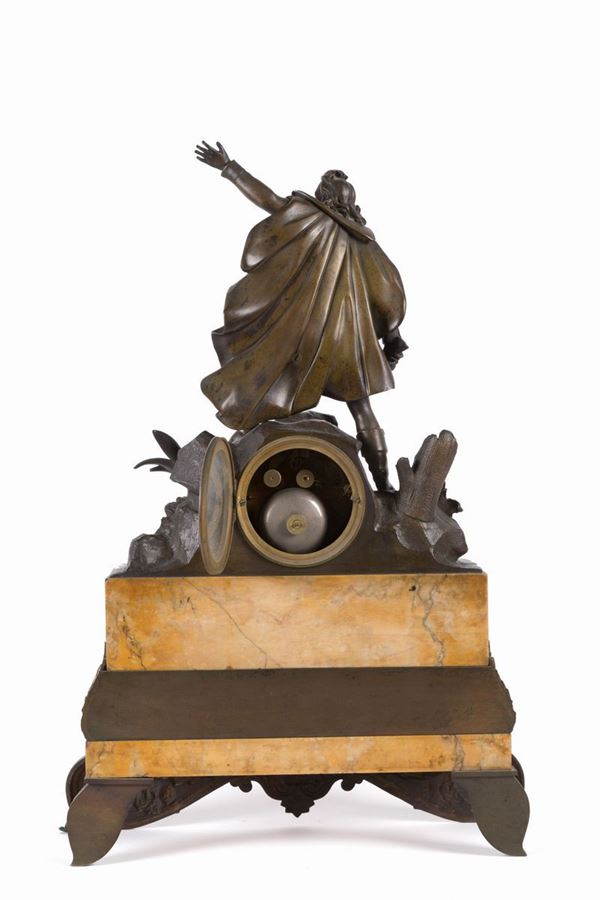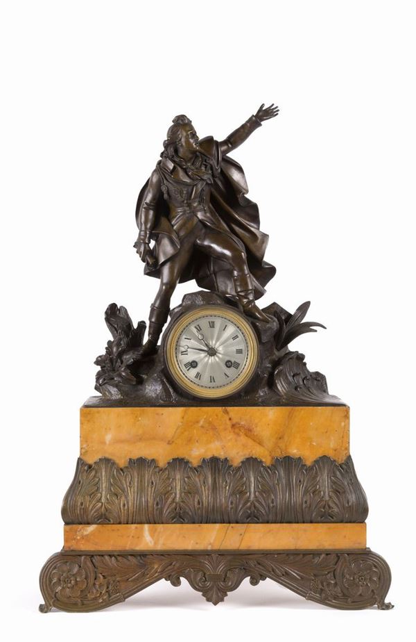 Orologio in bronzo cesellato e brunito decorato con personaggio. Base in marmo. Fine XIX secolo.