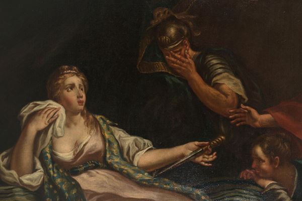 Dipinto olio su tela raff. ''IL SUICIDIO DI LUCREZIA''. In cornice. Restauri. Già rintelato e rintelaiato.