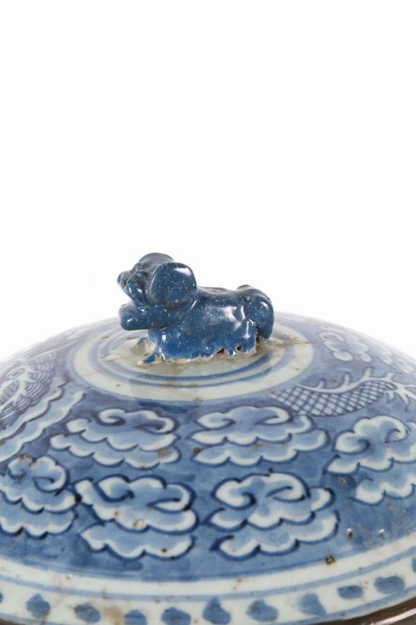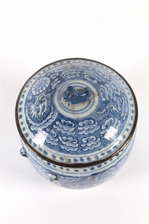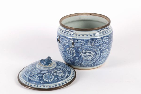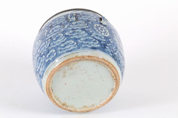 Pentola in porcellana bianca e blu. Cina. XIX secolo.