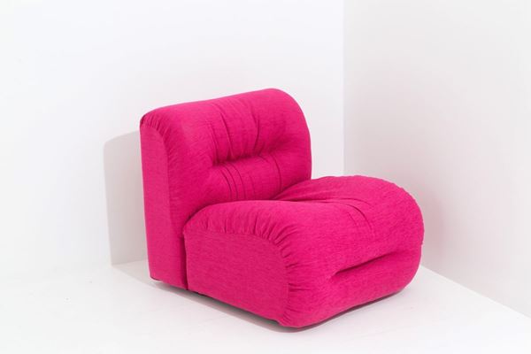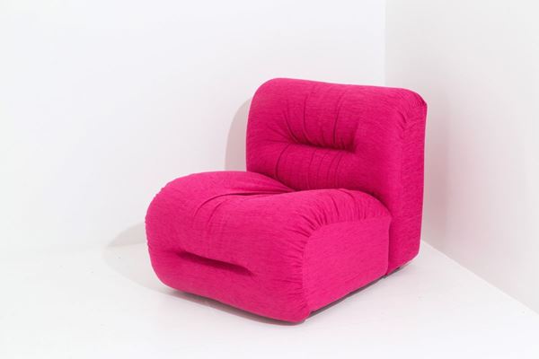 Poltrona in tessuto fucsia e tavolino con piano in vetro specchiato. Modello Bonheur Produzione SPAGNOL. Anni '70. Rifoderati.