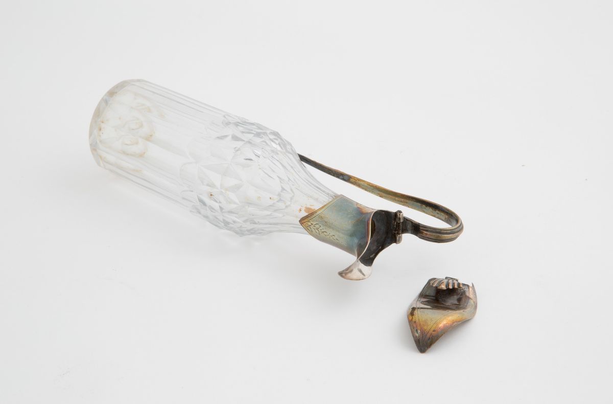 Otto ampolle in vetro molato per condimenti con cestello in argento traforato, gr. 460 ca. Inghilterra. Inizi XX secolo.