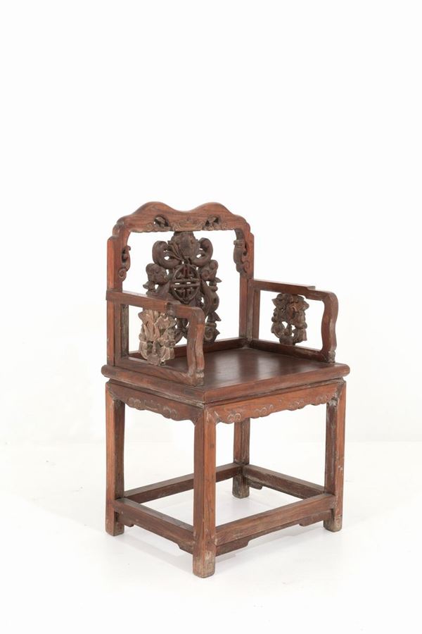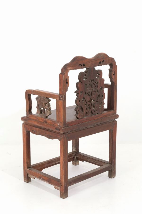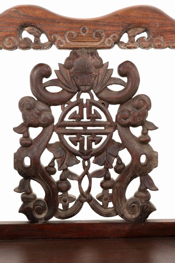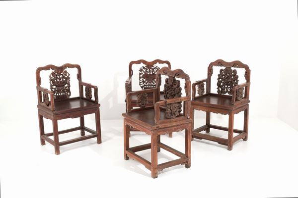 Quattro sedie in legno intagliato. Cina.