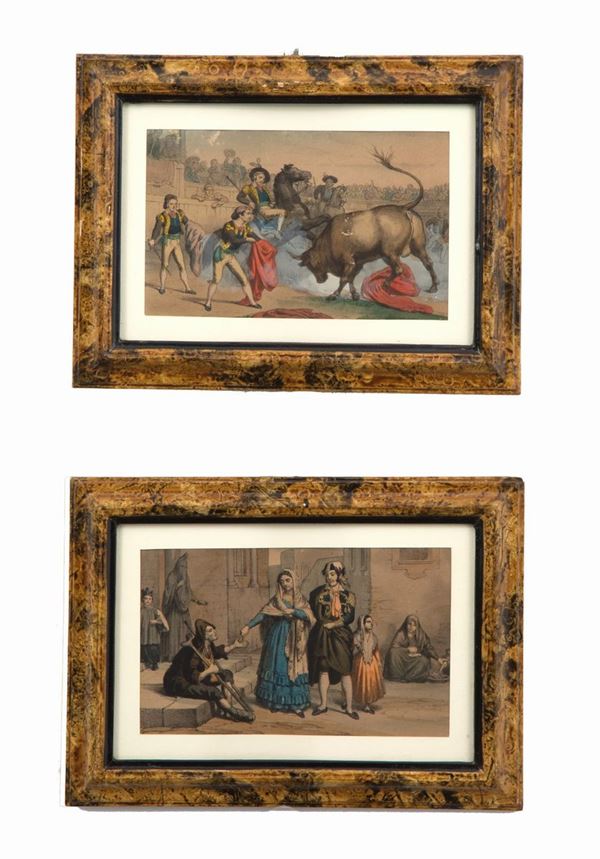 Quindici stampe acquarellate raff. "SCENE DI GENERE". In cornici laccate.