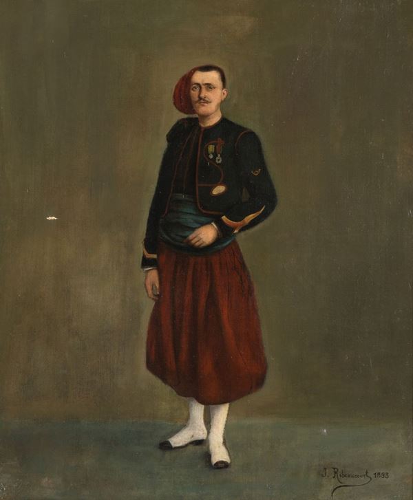 Dipinto olio su tela raff. ''ZUAVO''. Firmato e datato 1893 in basso a destra. In cornice. Difetti.