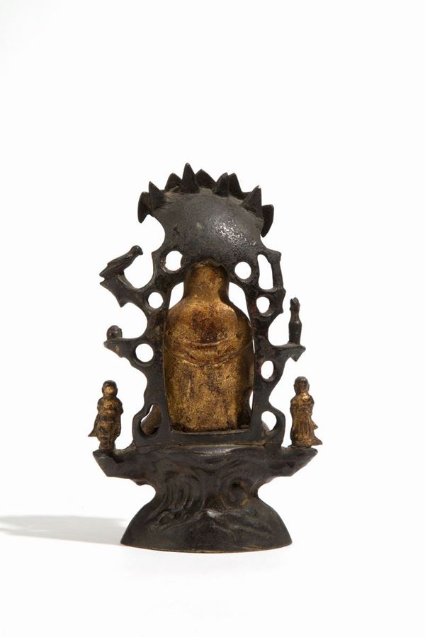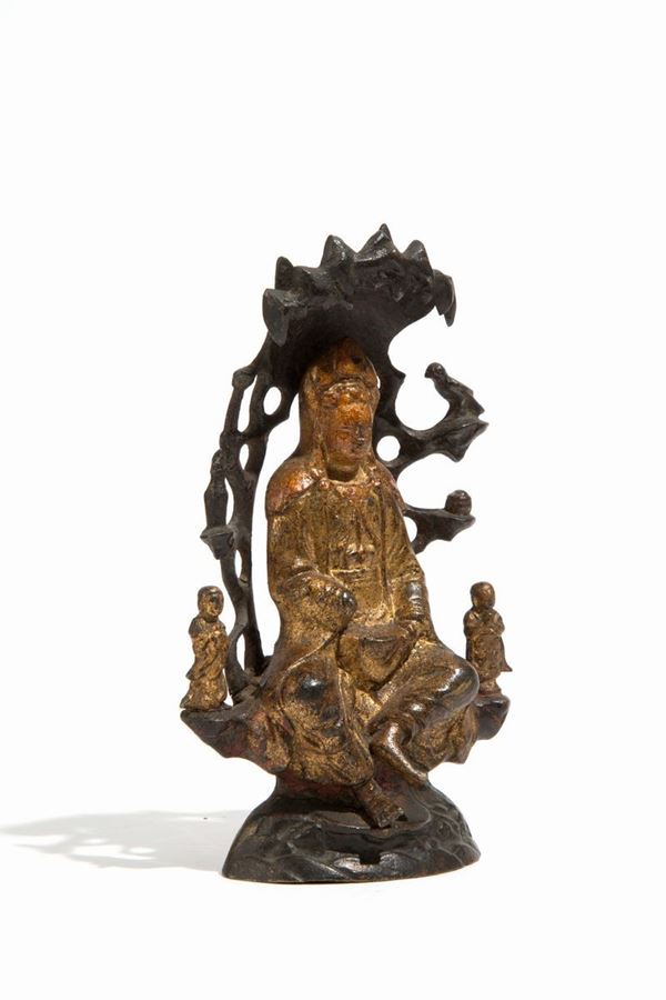 Scultura in bronzo parzialmente dorata raff. "GUANYIN SEDUTA SUL TRONO". Cina.