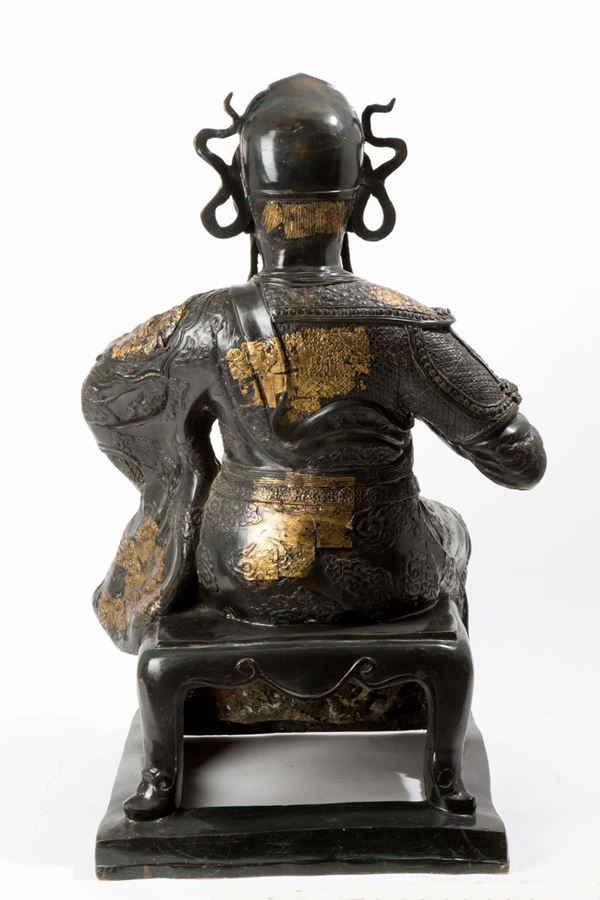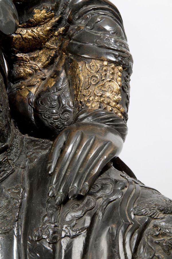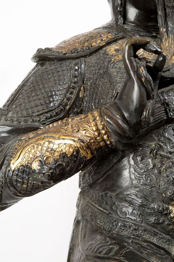 Scultura in bronzo patinato e dorato raff. "TAOISTA". Cina.