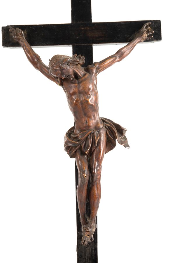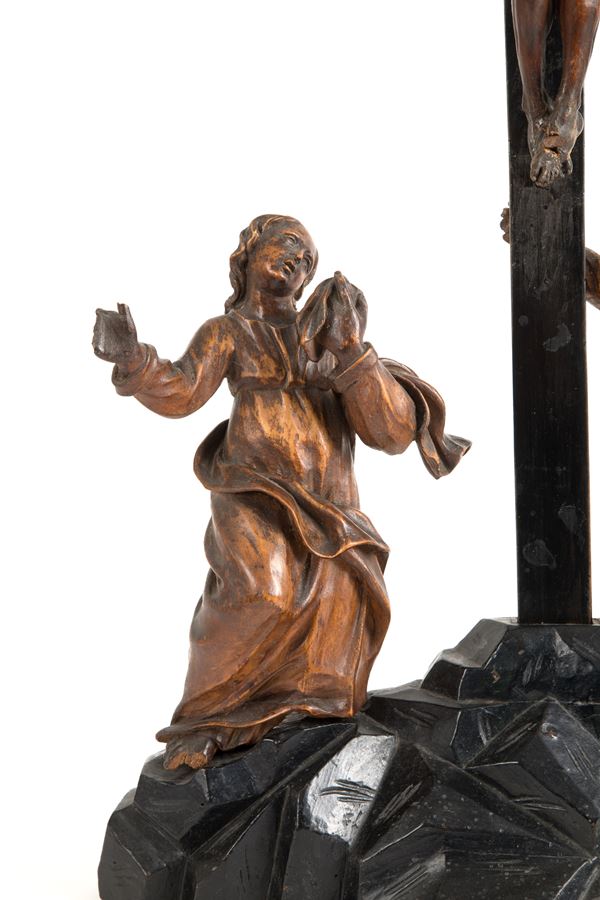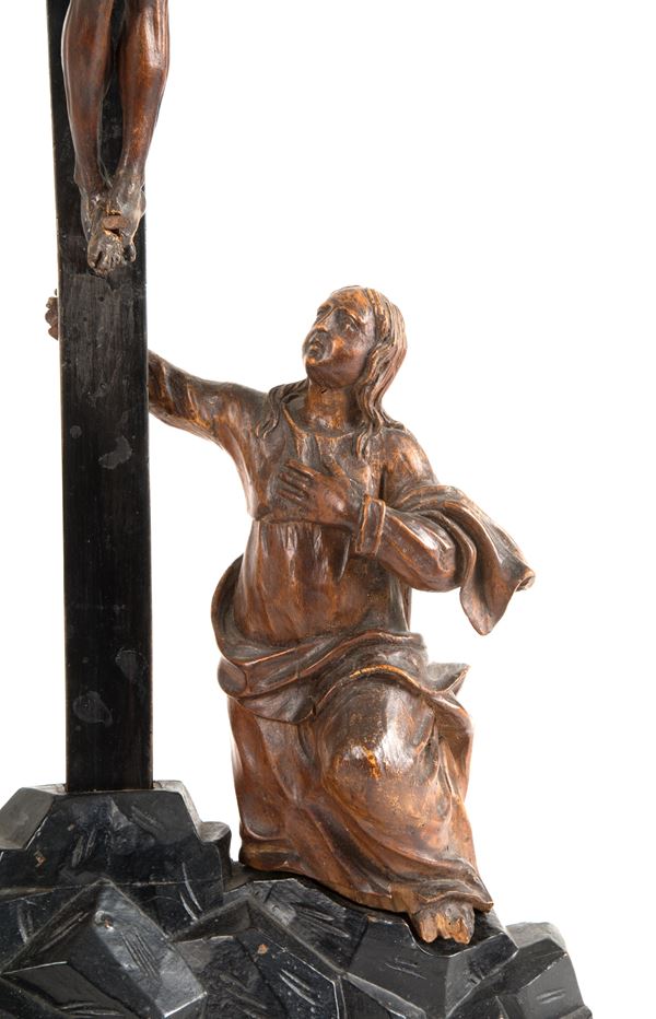 Scultura in legno intagliato e argento raff. "CROCIFISSIONE CON SAN GIOVANNI EVANGELISTA E MARIA MADDALENA". XVIII secolo. Difetti.