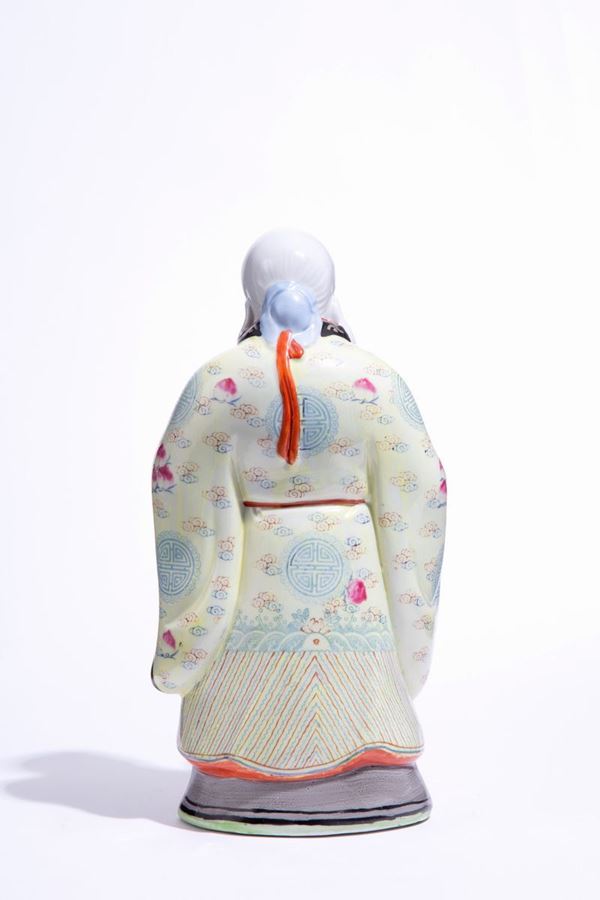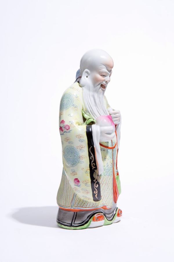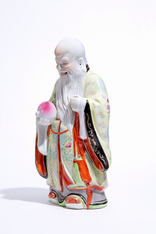 Scultura in porcellana dipinta raff. "SANTONE CON FRUTTO IN MANO". Marcato sul fondo. Cina. Lievi difetti.