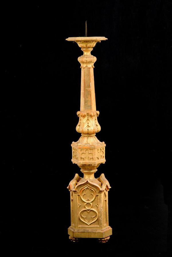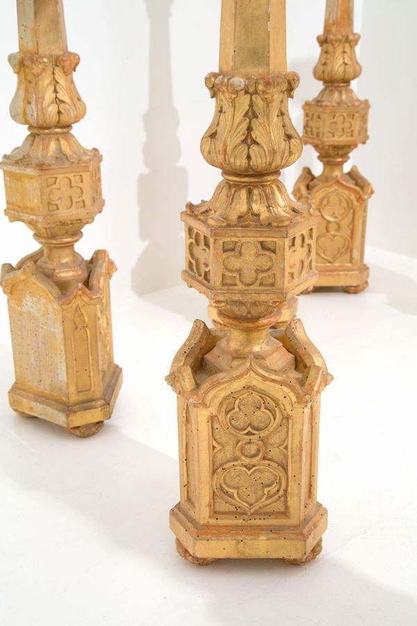 Sei candelabri in legno finemente intagliato e dorato. Genova. Fine XVIII secolo.
